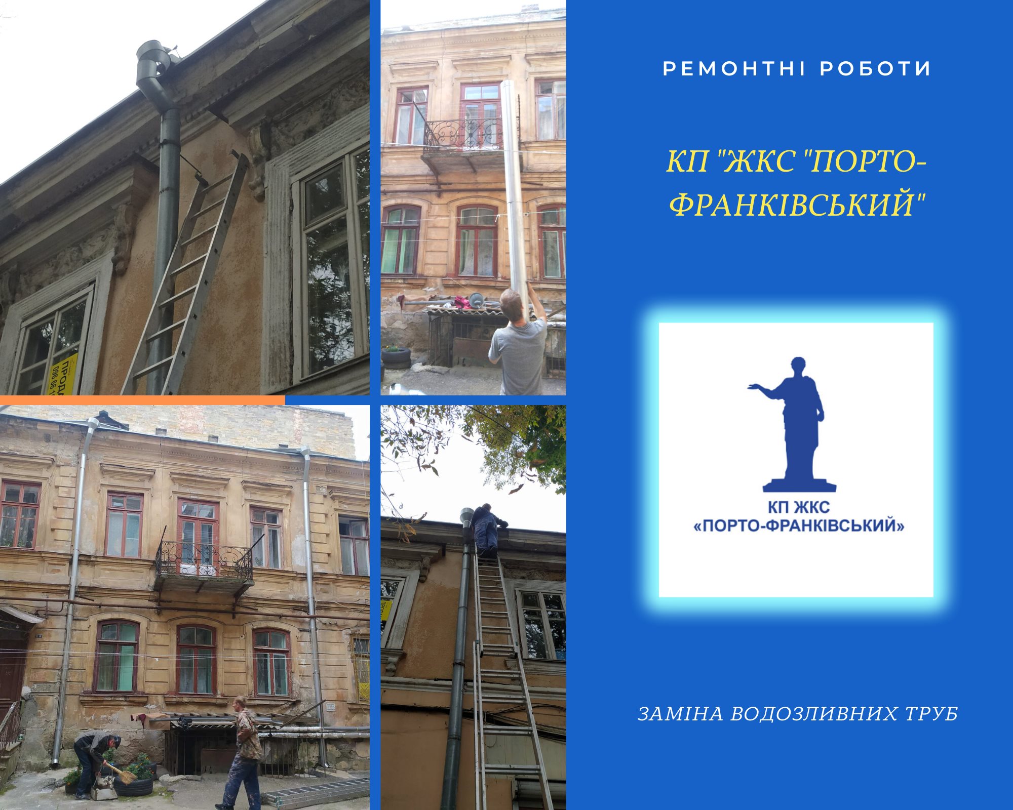 На території обслуговування ЖКС "Порто-Франківський" тривають ремонтні роботи. На фото: фахівці нашого комунального підприємства виконали заміну двох стояків водозливних труб за адресою вул Ніжинська, 58.